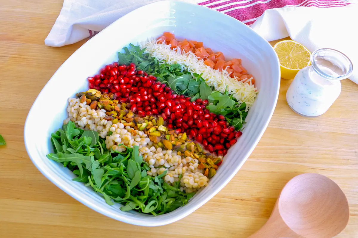 Chopped Salad With Israeli Couscous, Pomegranate, Smoked Salmon & Creamy Basil Dressing