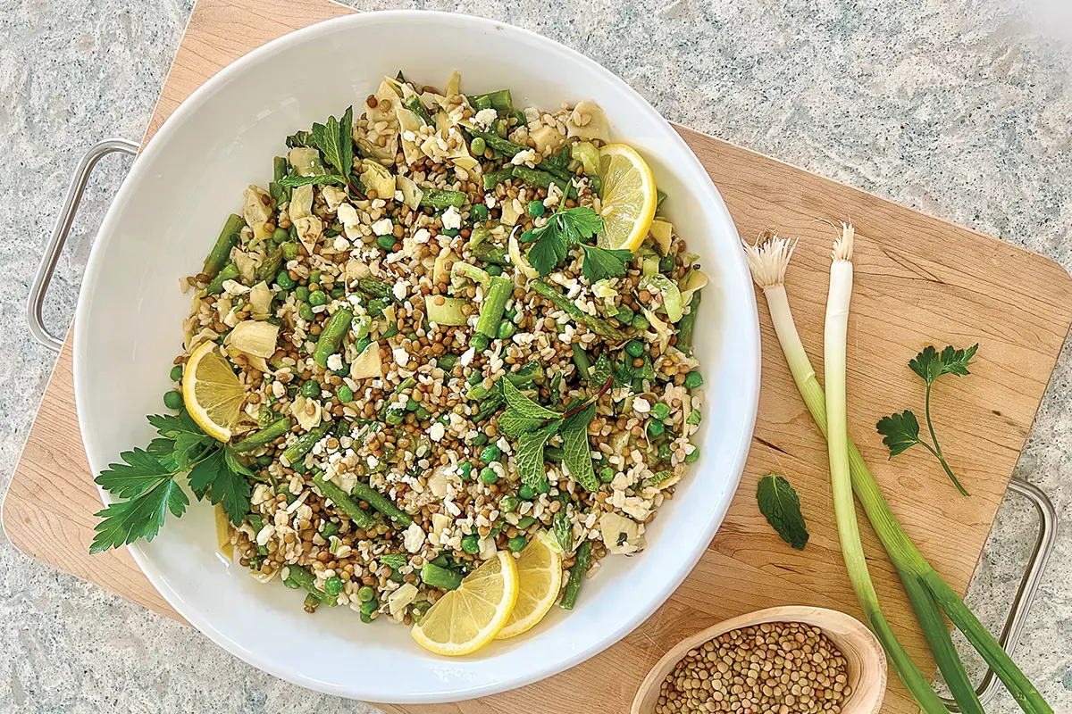 This spring-inspired salad is a crowd pleaser! It serves eight as a main dish and more as a side. It’s made with the season’s freshest asparagus and peas, crunchy celery, zesty marinated artichoke hearts, hearty lentils and rice, fragrant herbs, and a simple homemade vinaigrette. It comes together quickly, but to save more time, look for cooked lentils at the market (canned or in a microwavable pouch) or swap the lentils for a can of drained and rinsed chickpeas.